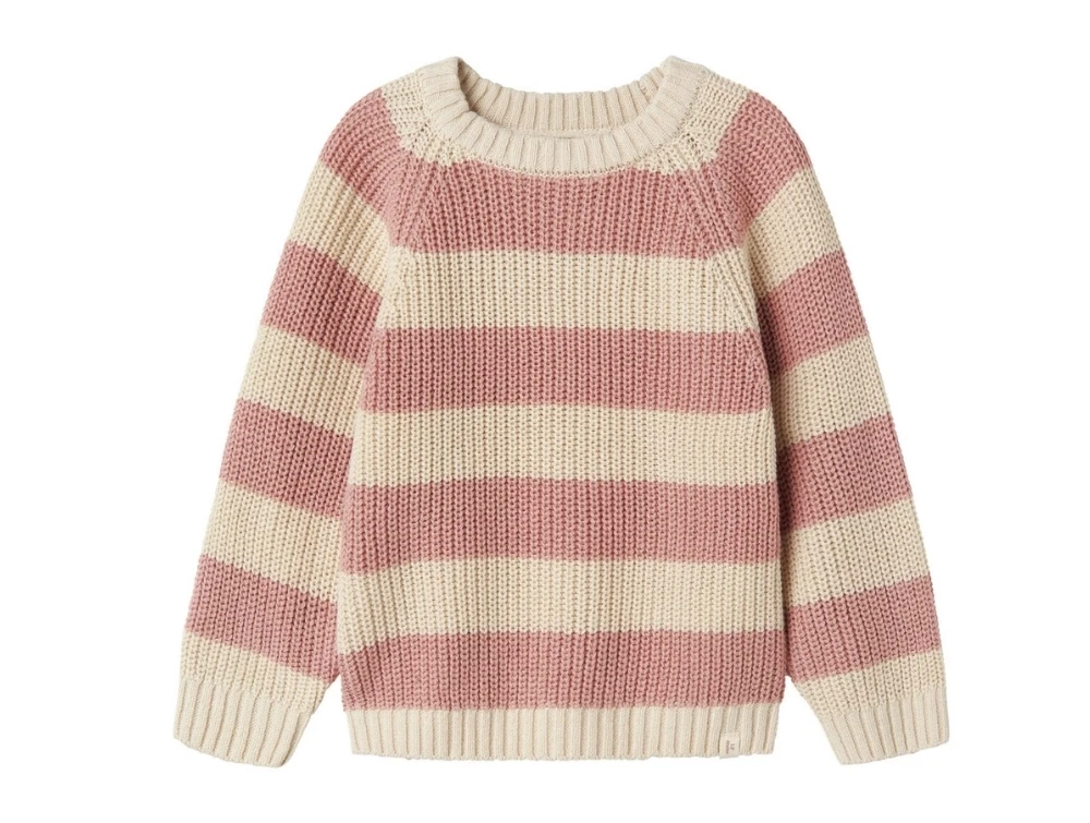 Striktrøje i råhvid nuance fra Lil' Atelier med brede rosa striber. En klassisk strik med rund hals, lange ærmer og ribkanter ved hals, ærmer og bund.