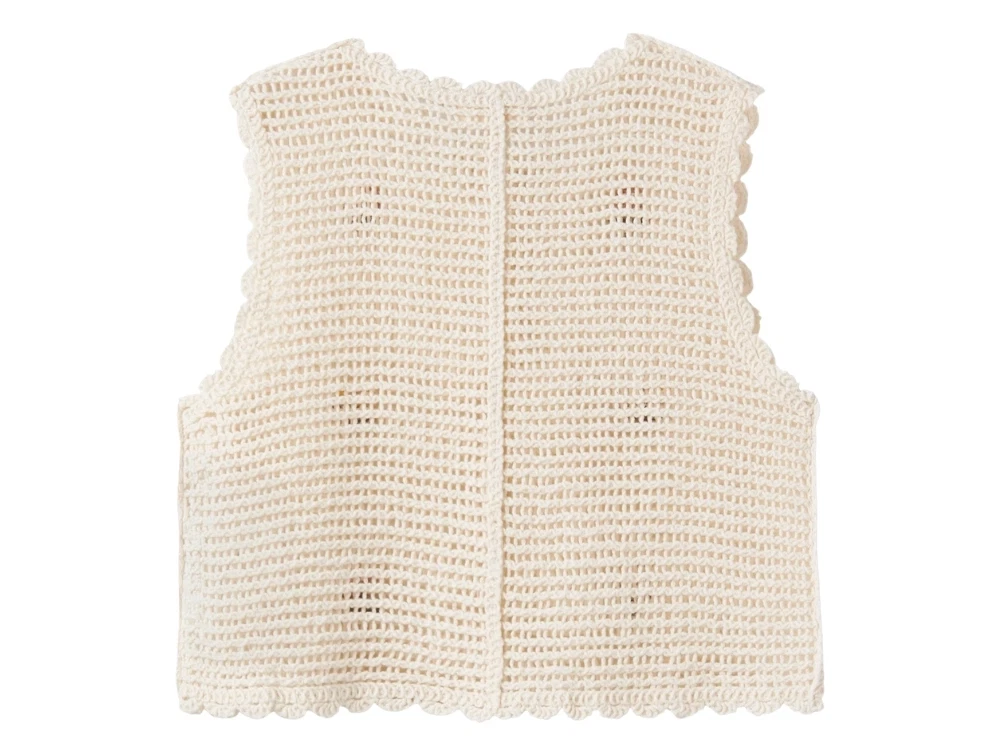 Modellen er hæklet i åben struktur og har små blomsterbroderier samt knaplukning foran.