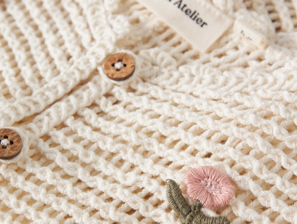 Lil' Atelier strikvest coconut milk med blomsterbroderi