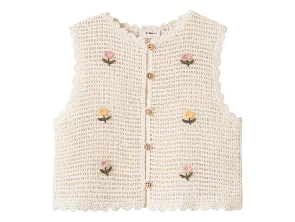 Mere information om Lil' Atelier strikvest coconut milk med blomsterbroderi