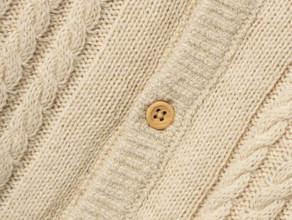 Dragten har raglanærmer, manchetter i rib og knaplukning.