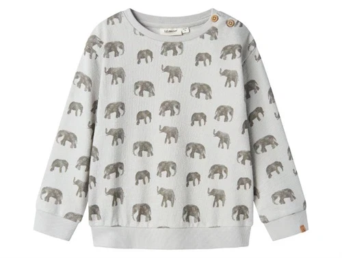 Sweatshirt i lyseblå fra Lil' Atelier med et blødt allover-print af grå elefanter og to fine træknapper på skulderen.
