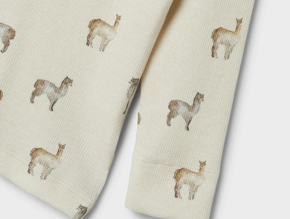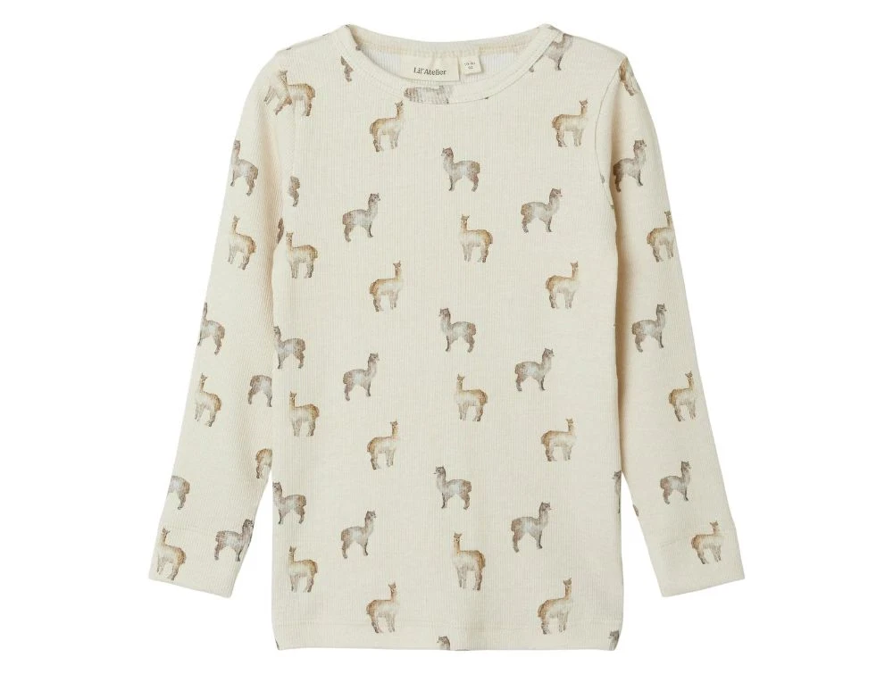 Langærmet ribtop i lys birch-farve fra Lil' Atelier med print af små alpakaer over hele stoffet.