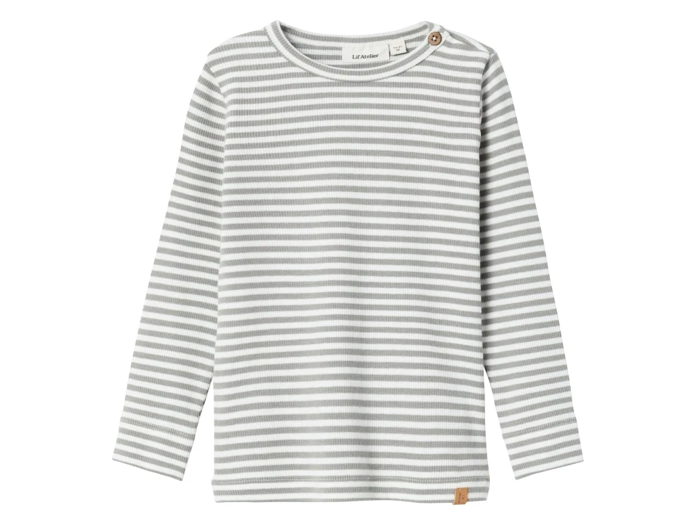 Langærmet top i grå og hvide striber fra Lil' Atelier med knapper ved skulderen.