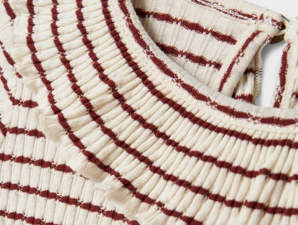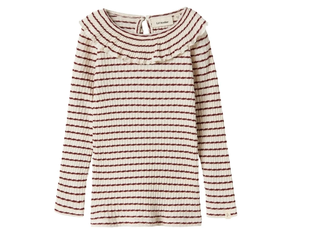 Ribstrikket top i råhvid nuance med rødbrune striber fra Lil' Atelier. Den langeærmede top har rund hals med flæsekant og en lille knaplukning i nakken.