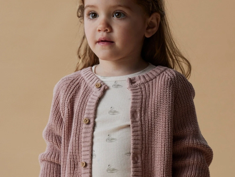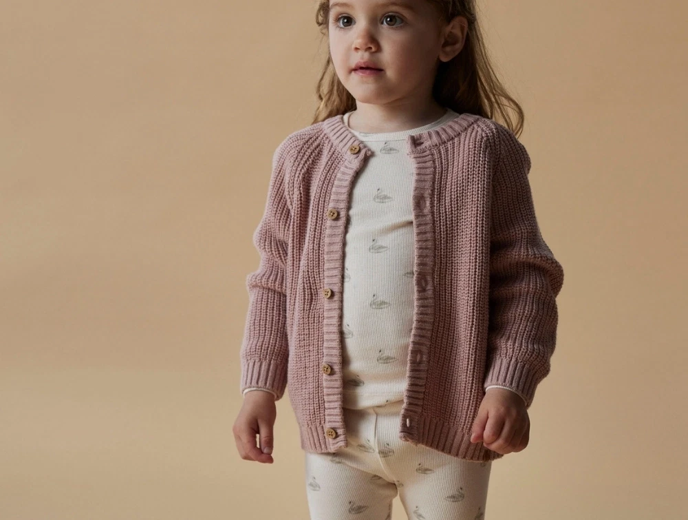 Ribstrikket top i beige nuance med svaneprint fra Lil' Atelier. Toppen har rund hals, lange ærmer og flæser på skuldrene, som giver et fint og feminint udtryk.