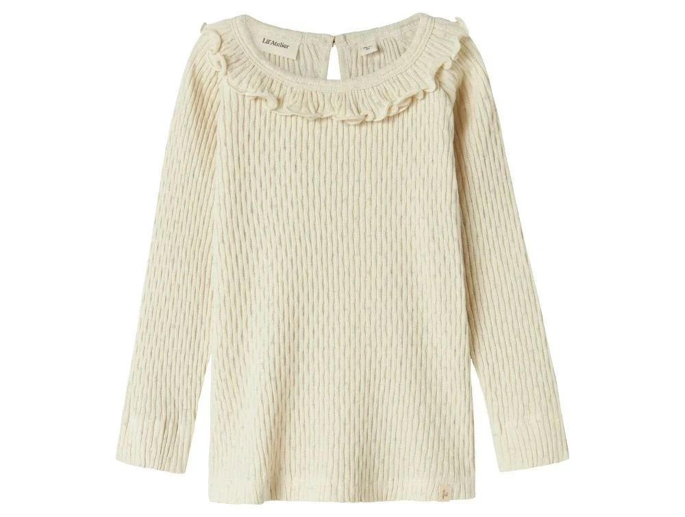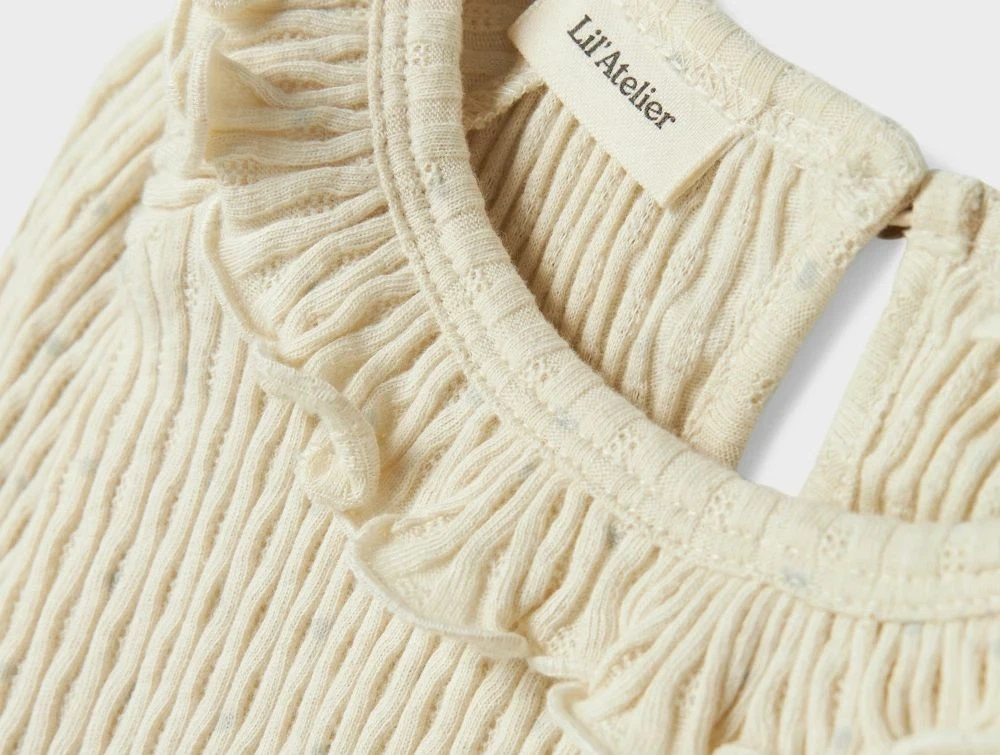 lil\' atelier top i creme med flæsekant ved halsen og hjerter, set forfralil\' atelier top i creme med smal rib og flæsedetalje, tæt på halsudskæringen
