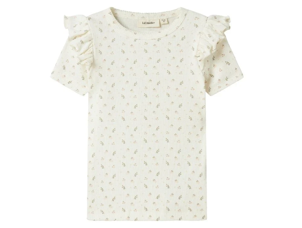 T-shirt fra Lil\' Atelier i coconut milk med blomsterprint og flæserNærbillede af ribstruktur og blomsterprint på Lil\' Atelier t-shirt i coconut milk