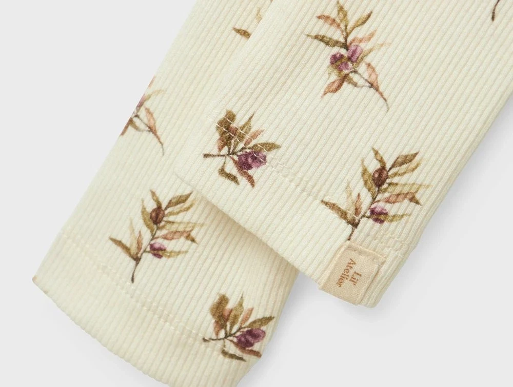 Leggings i farven turtledove med olivenprint fra Lil' Atelier. Produceret i 57% økologisk bomuld, 38% TENCEL™ Lyocell og 5% elastan.