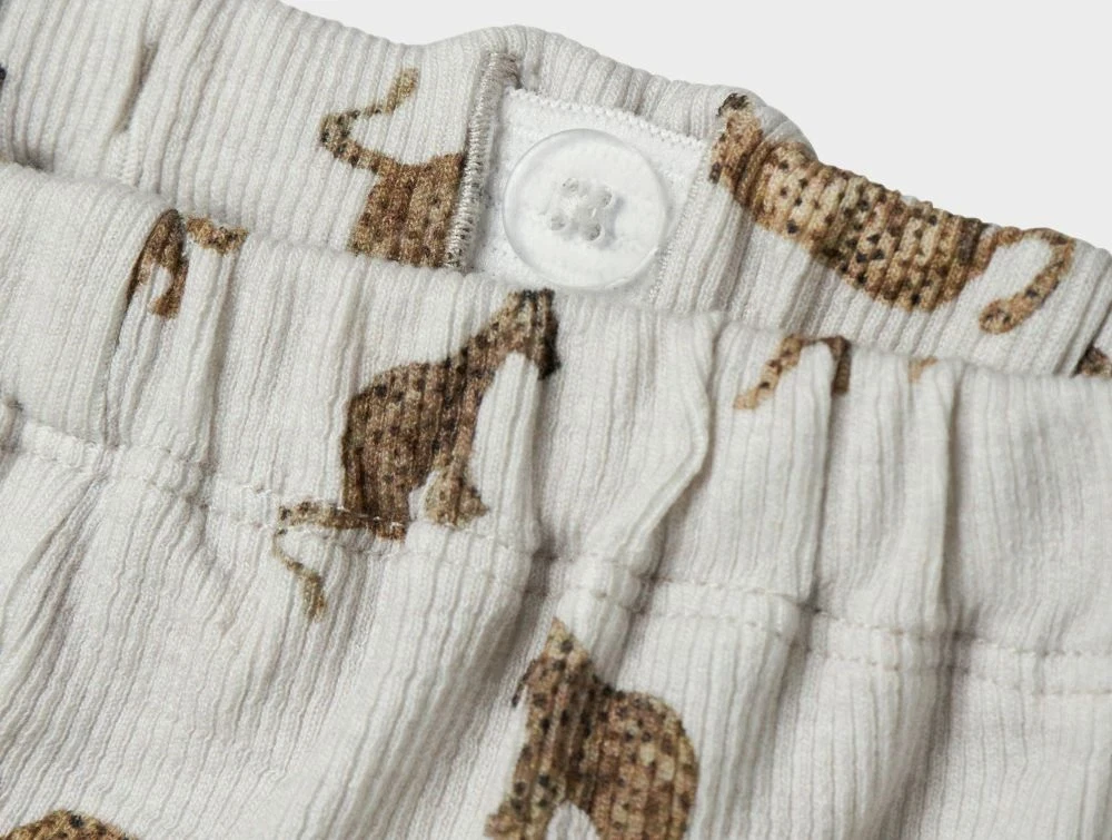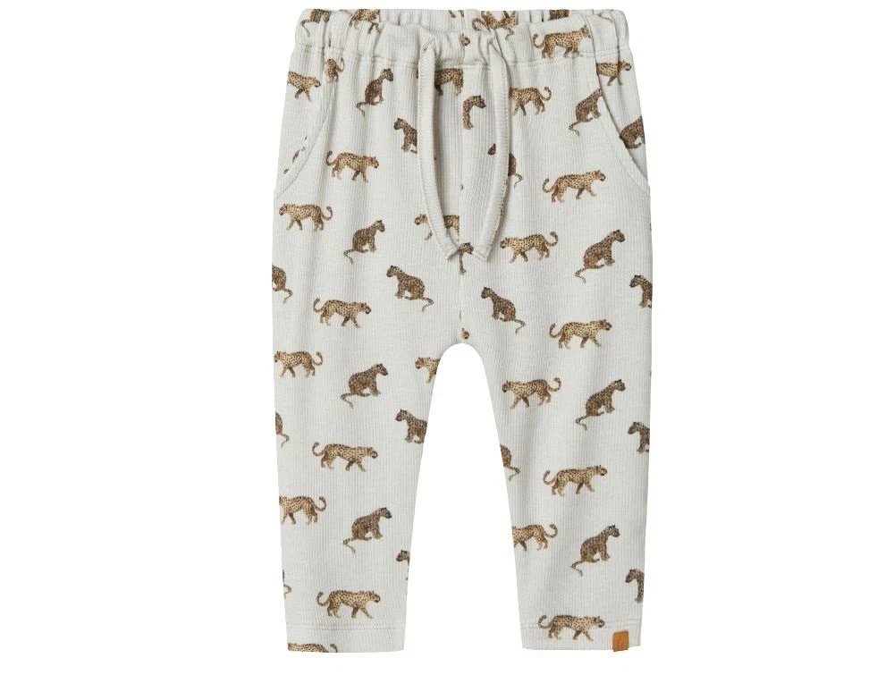 Bukser i farven vapor blue med print af geparder fra Lil' Atelier. Justerbar elastik i taljen. Produceret i 57% økologisk bomuld, 38% TENCEL™ Lyocell og 5% elastan.