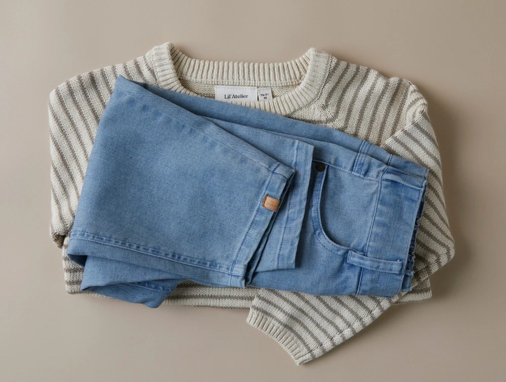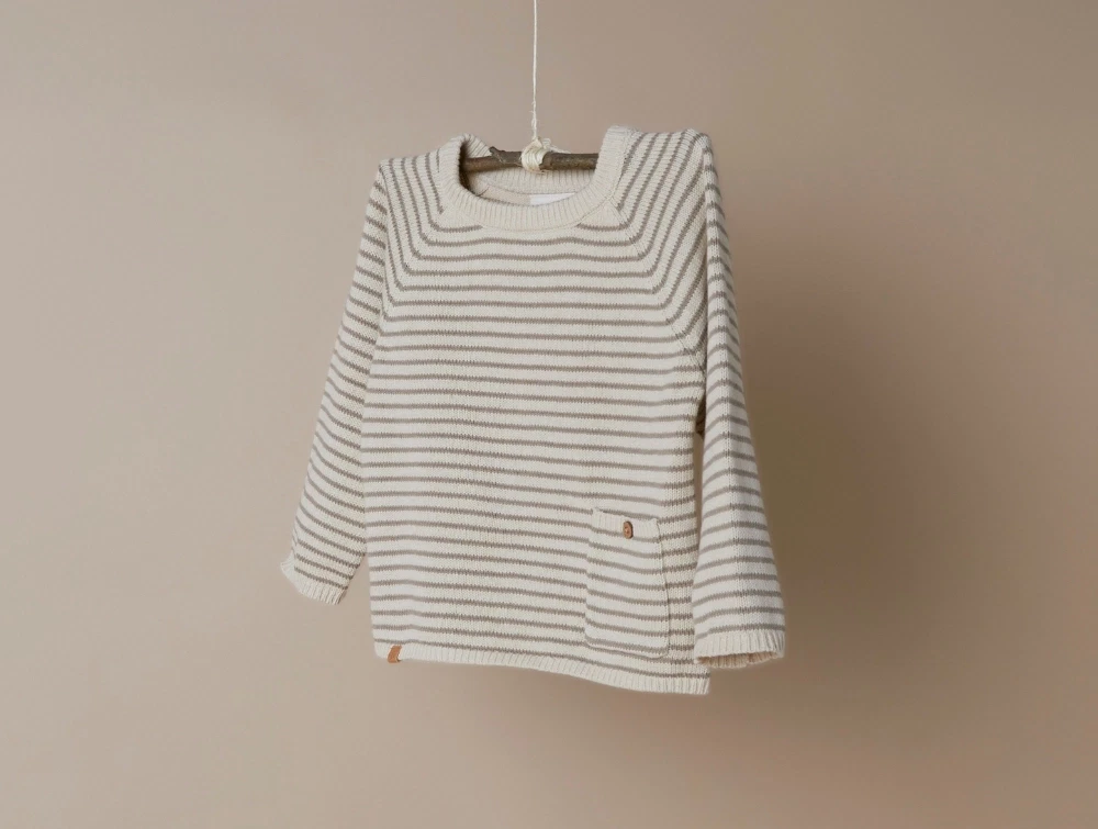 Stribet strik i farven wood ash med lille forlomme fra Lil' Atelier.