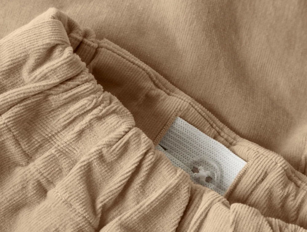 Bukserne er lavet i 98% bomuld (økologisk) og 2% elastan. Fløjlskvaliteten har en blød ribbet overflade og let stræk, som giver en behagelig pasform og god bevægelsesfrihed. Modellen har almindelig pasform over hoften og løstsiddende ben samt justerbar talje.