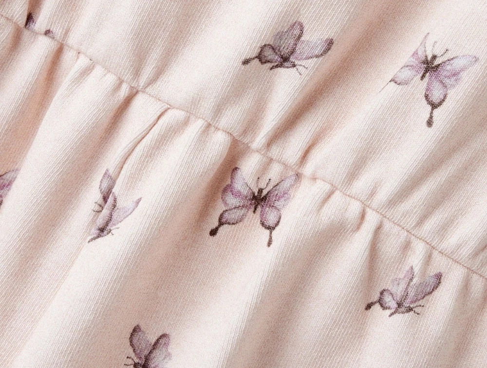 Modellen er fremstillet i blød jersey med fint sommerfugleprint og elastik i taljen.