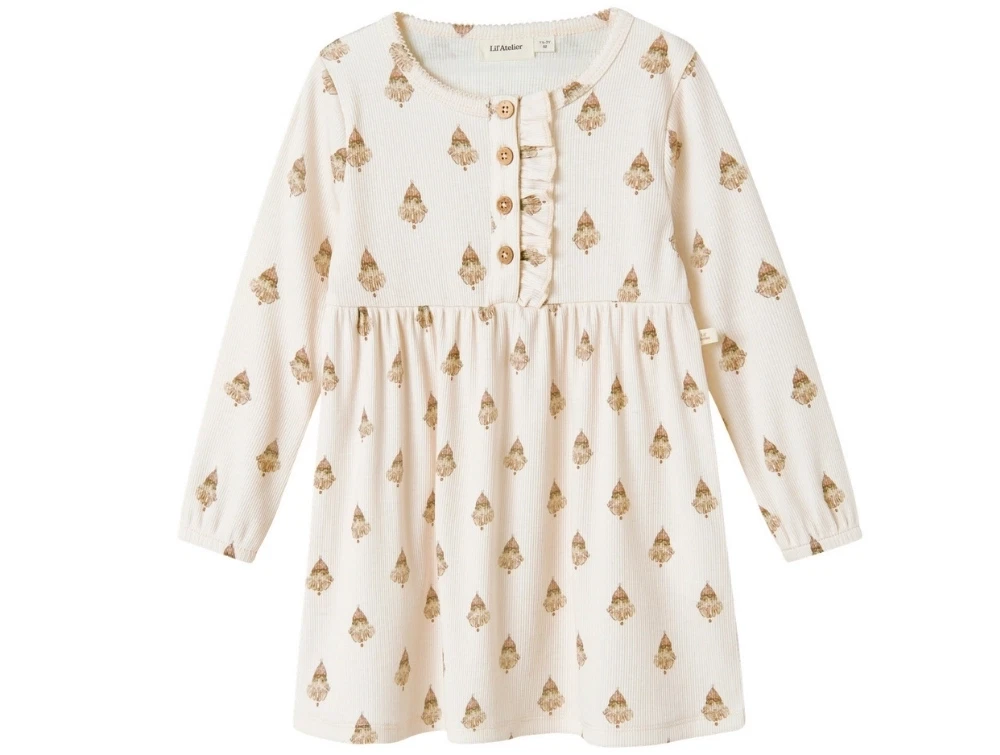 Kjole i råhvid nuance med klovneprint fra Lil’ Atelier. Kjolen er fremstillet i blød ribstrikket jersey med let stræk, som giver god bevægelsesfrihed. Designet har grandad-hals med knapper, lange ærmer og elastik ved håndleddene. En sød og blød hverdagskjole i almindelig pasform.