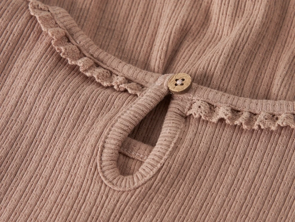 Modellen er fremstillet i blød rib med fin blondedetalje ved halsudskæringen og knaplukning i nakken.