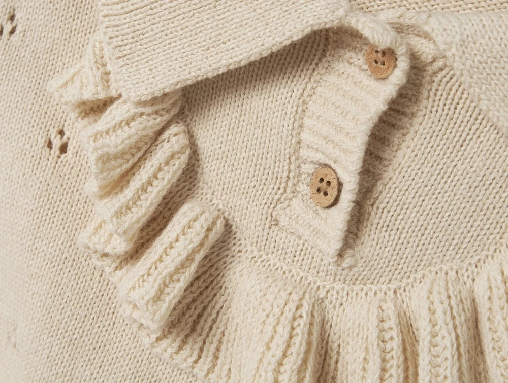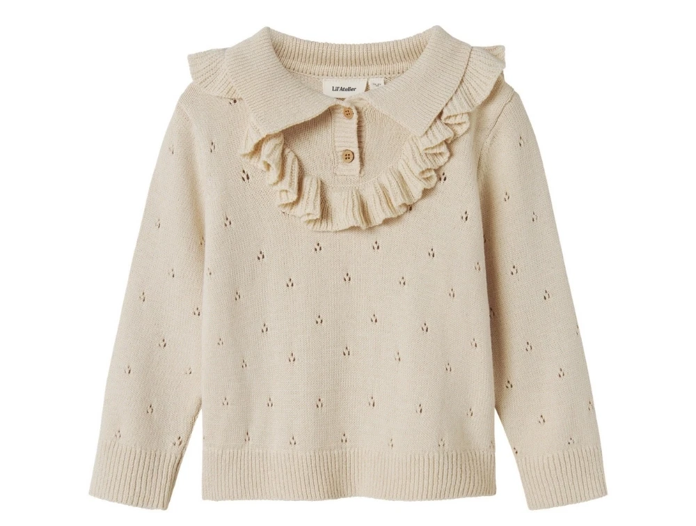 Strikpolo i lys beige nuance fra Lil’ Atelier. Fremstillet i blød bomuldsstrik med fine hulmønstre og flæsedetalje langs kraven. Modellen har løs pasform, lange ærmer og små træknapper foran.