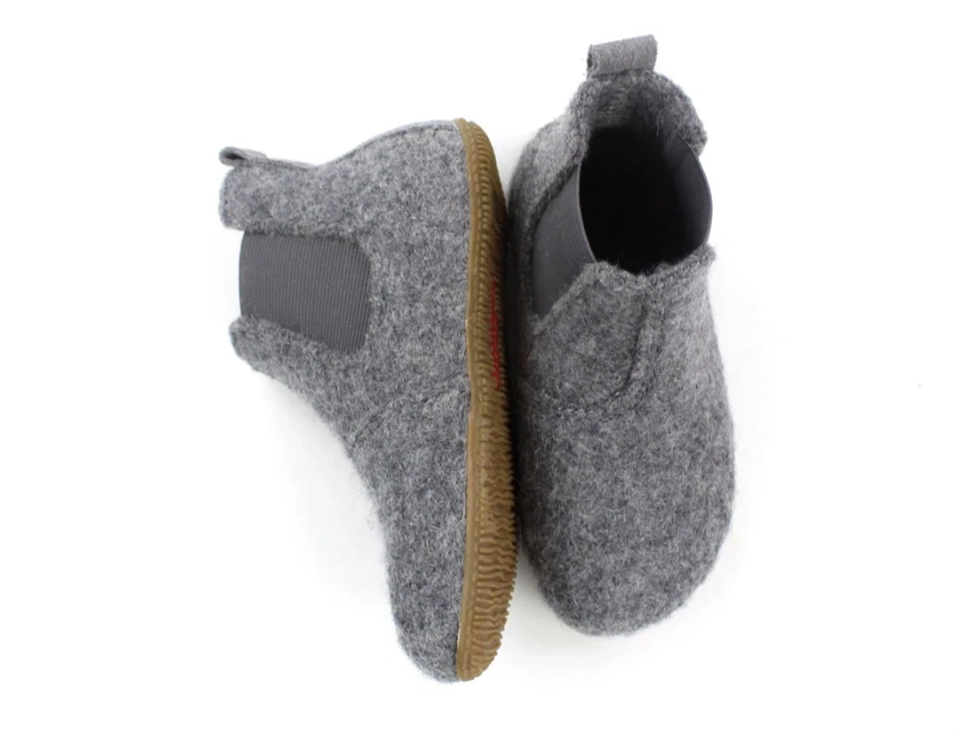 Grå uldhjemmesko fra Living Kitzbühel med praktisk tynd gummisål og grå ruskind på hælkappen.