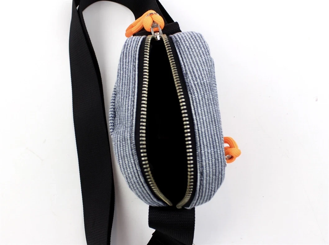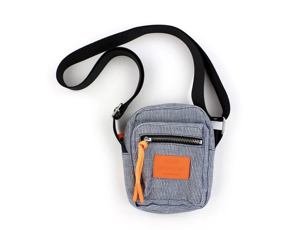 Stribet lille skuldertaske i farverne estate blue og cloud dancer fra Mads Nørgaard.