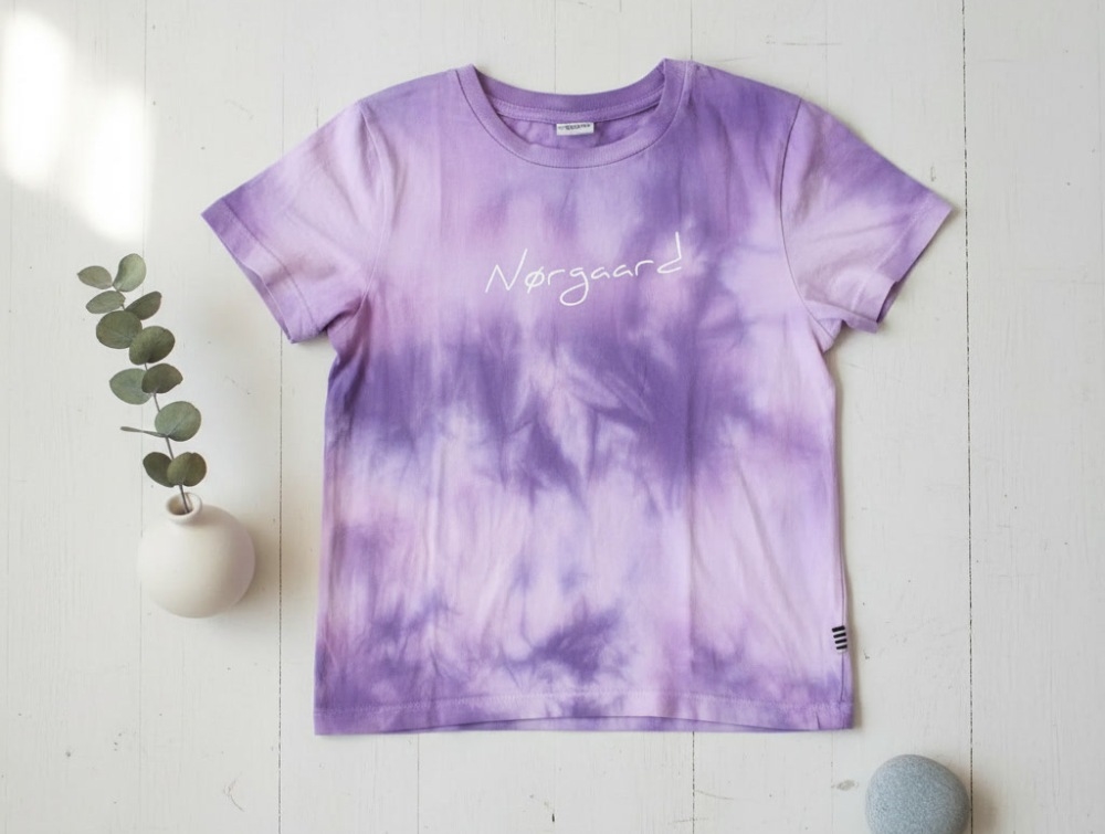 Tie dye t-shirt i farven lavendula med logoprint fra Mads Nørgaard.