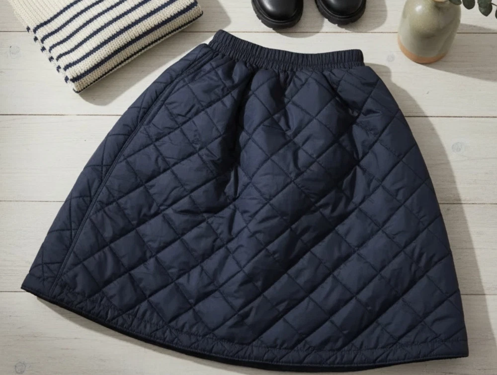 Mørkeblå quiltet nederdel fra Mads Nørgaard. Nederdelen har elastik i linningen.