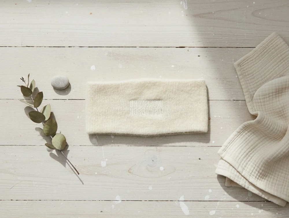 Pandebånd i farven sand shell med tone-i-tone logo fra Mads Nørgaard.