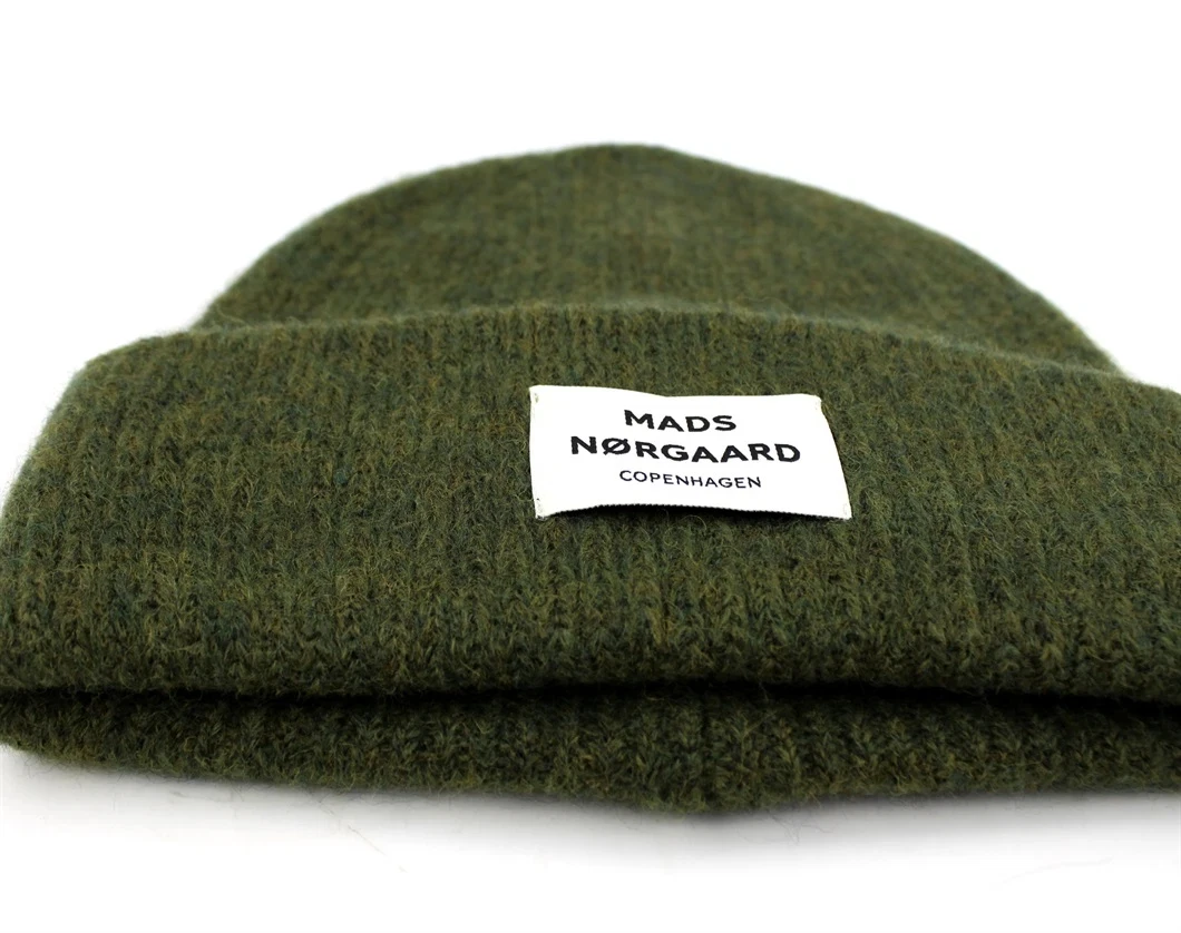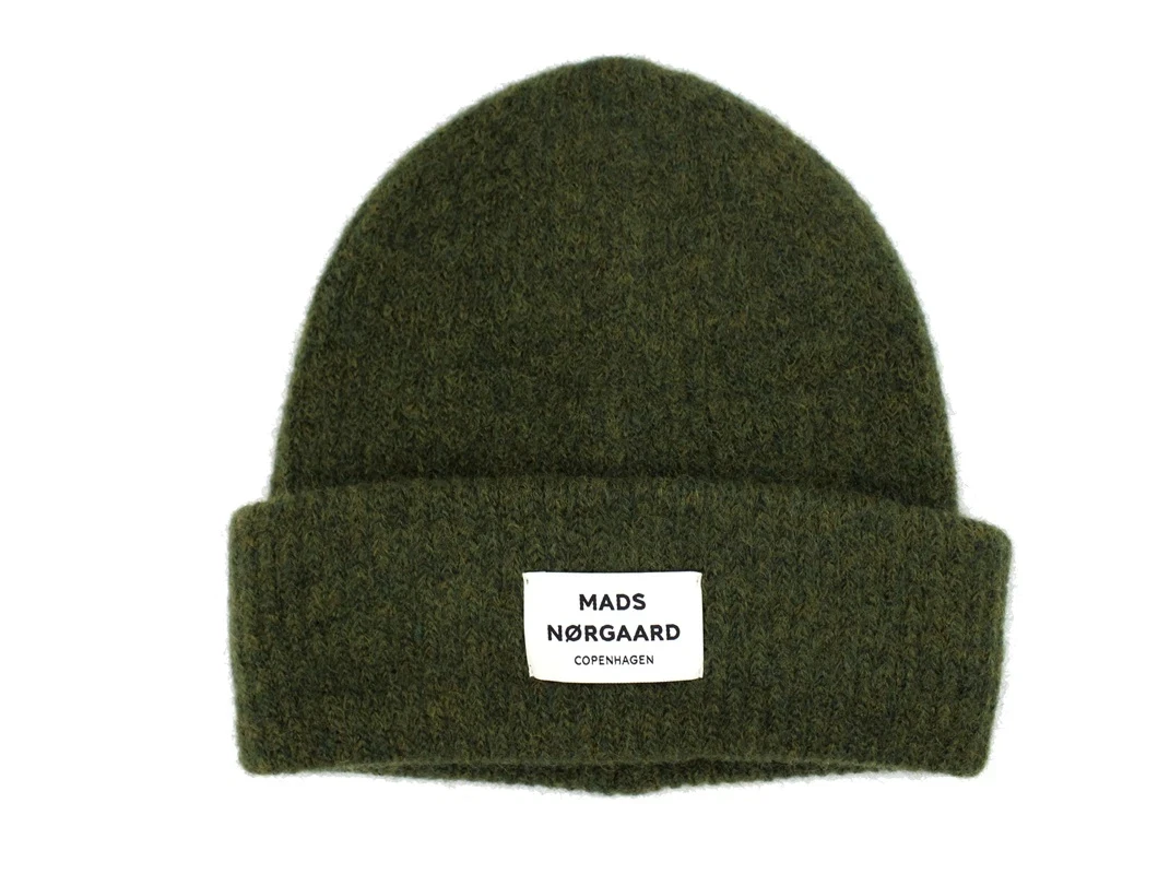 Huen er rustikt patentstrikket og har et logo-label. Anju huen er populær blandt voksne og større børn