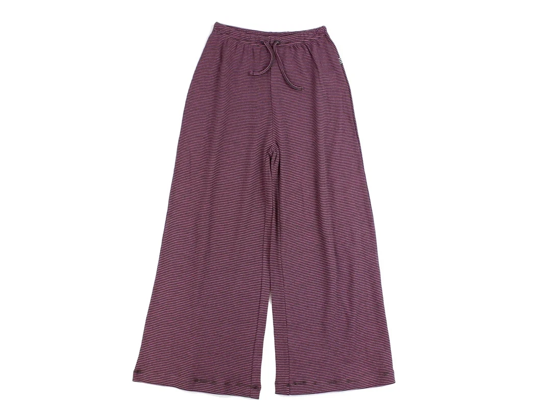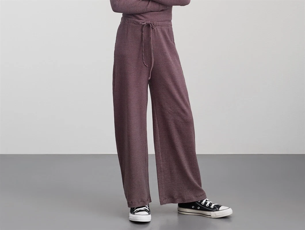 Bløde brede bomuldsbukser i striberne rosin og camine rose fra Mads Nørgaard.
