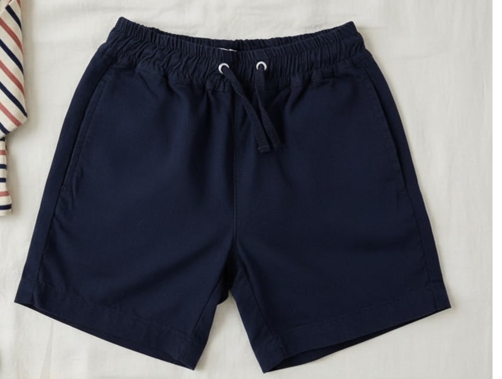Shorts i babyfløjl i farven parisian night med elastik i linningen og tre lommer fra Mads Nørgaard.