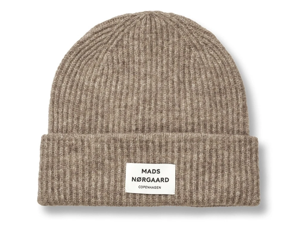 Ribstrikket Anju hue fra Mads Nørgaard i farven roasted cashewLogolabel på Anju hue i brun nuance fra Mads Nørgaard