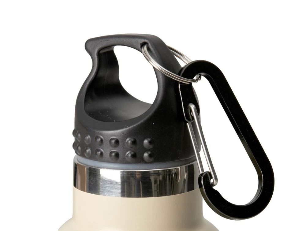 Denne drikkedunk er fremstillet i 80% rustfrit stål og 20% polypropylen. Den er robust og designet til både kolde og varme drikke. Låget har en rillet overflade, som gør det nemt at gribe og åbne, og karabinhagen gør det let at fastgøre dunken til tasker, rygsække eller bæltestropper.