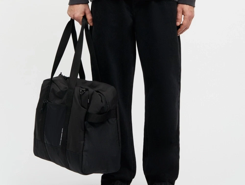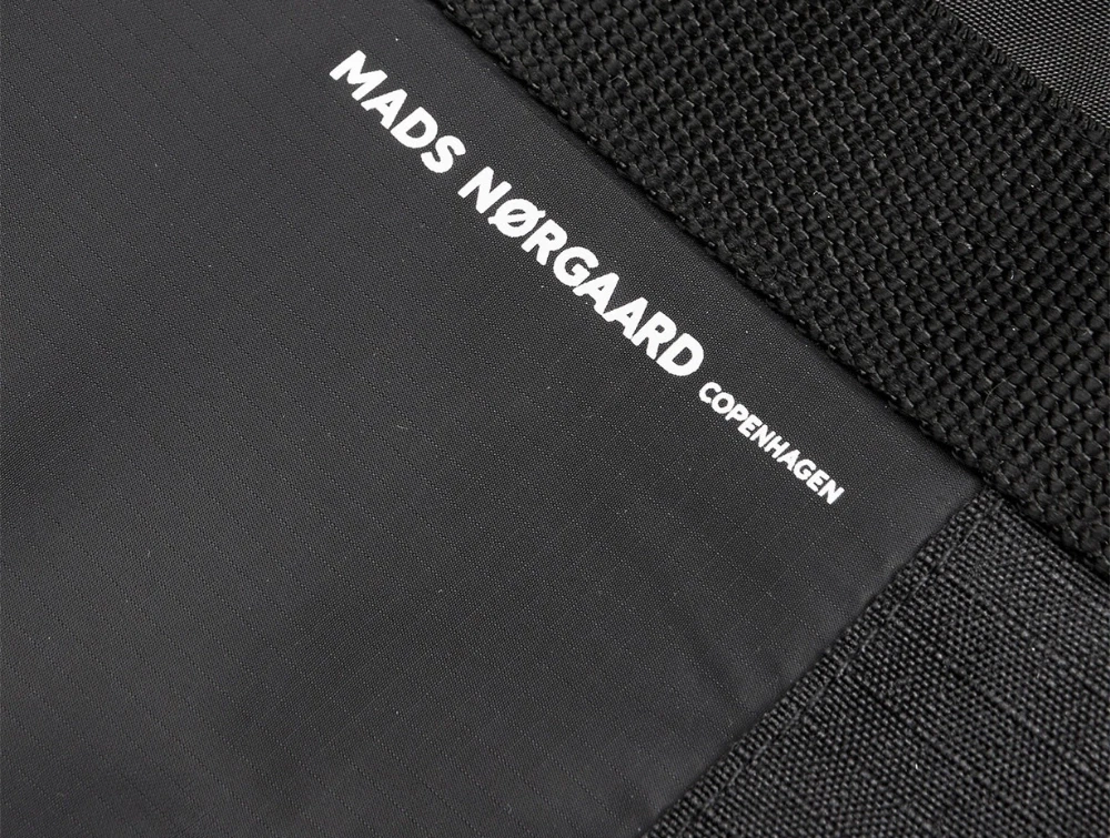 Mads Nørgaard rejsetaske i sort med justerbar skulderremMads Nørgaard taske bæres i hånden i sortNærbillede af Mads Nørgaard logo på sort rejsetaskeSort Mads Nørgaard taske med hvidt mærke og strop