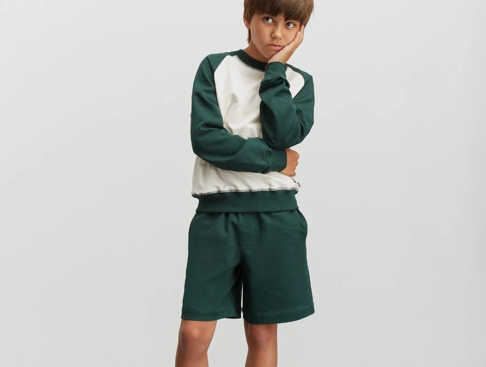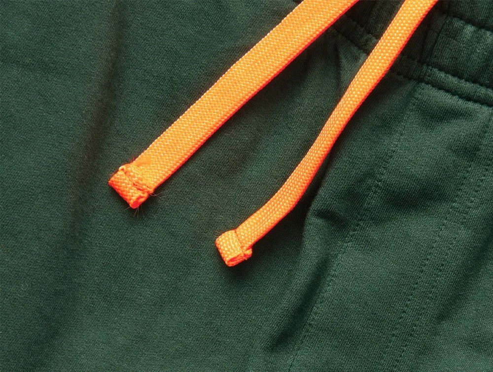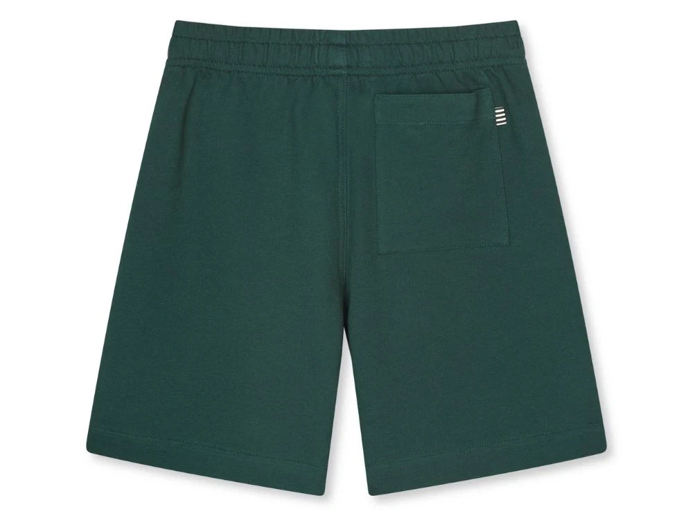 Shorts fra Mads Nørgaard i grøn farve set forfraShorts fra Mads Nørgaard i grøn farve set bagfraDetalje af grønne Mads Nørgaard shorts med orange snorBarn iført grønne Mads Nørgaard shorts og sweatshirt