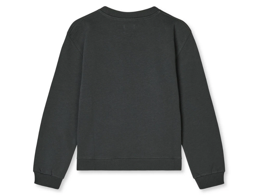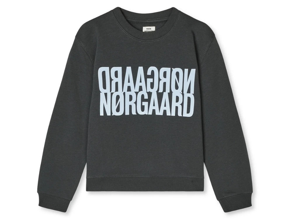 Sweatshirt i grå-sort (asphalt) fra Mads Nørgaard med stort lyseblåt spejlvendt logo på brystet.