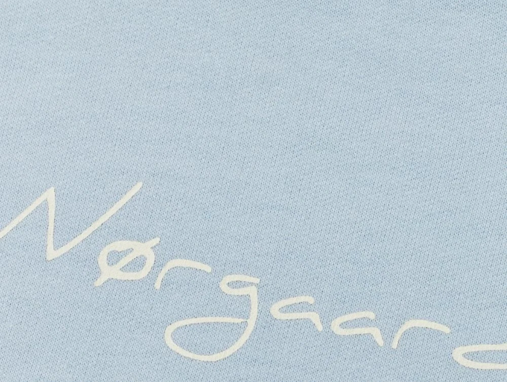Mads Nørgaard sweatshirt lyseblå med hvidt logoprint og rund halsnærbillede af logoprint på lyseblå sweatshirt fra Mads Nørgaard