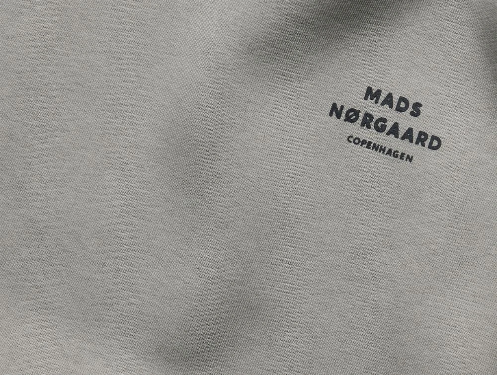 Mads Nørgaard sweatshirt i moon mist set forfra med hætteMads Nørgaard sweatshirt i moon mist set bagfra med hætteDetaljebillede af logo på Mads Nørgaard sweatshirt i moon mist