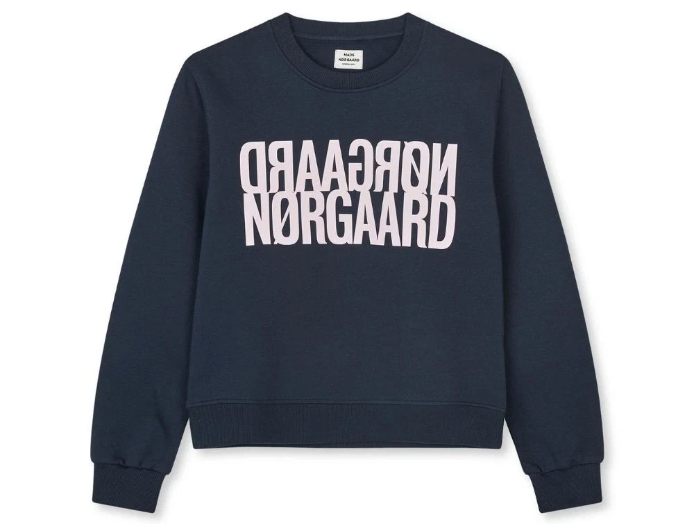 Sweatshirt i mørkeblå nuance (parisian night) fra Mads Nørgaard med stort spejlvendt logo i lyserød på brystet.