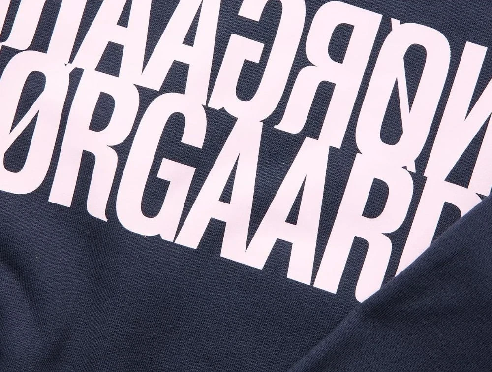 Mads Nørgaard sweatshirt i parisian night med lyserødt spejlvendt logoDetaljebillede af spejlvendt logo på Mads Nørgaard sweatshirt i parisian night
