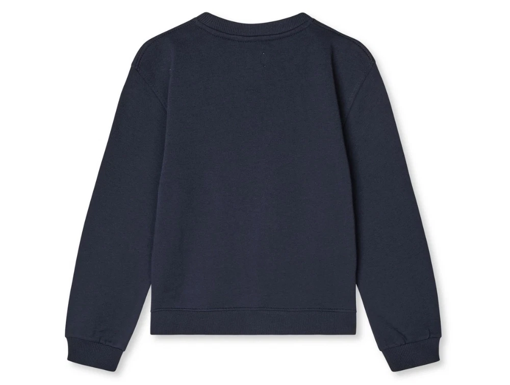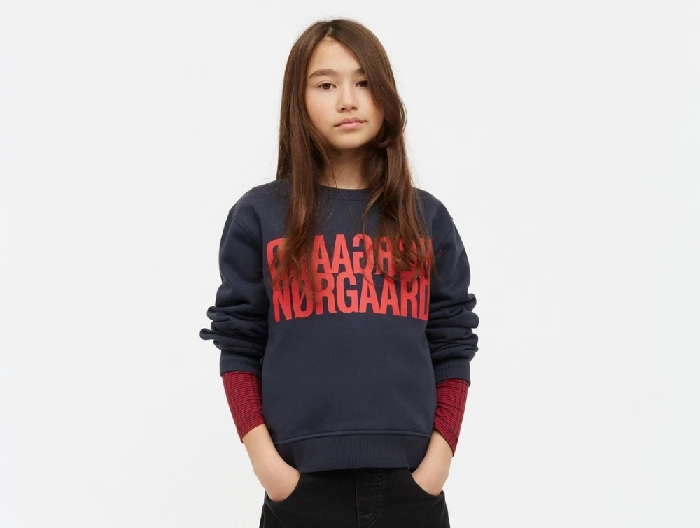 Mads Nørgaard sweatshirt i mørkeblå med spejlvendt rødt logoBarn iført mørkeblå Mads Nørgaard sweatshirt med rødt logoDetalje af spejlvendt Mads Nørgaard logo i rød på mørkeblå sweatshirtBagside af mørkeblå sweatshirt fra Mads Nørgaard uden print