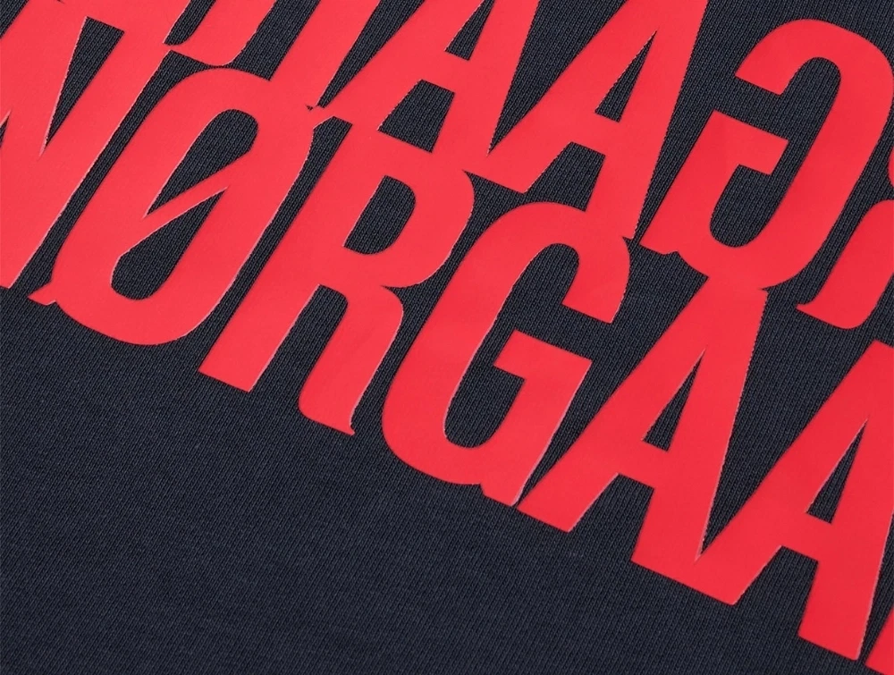 Sweatshirt i mørkeblå (parisian night) fra Mads Nørgaard med stort rødt spejlvendt logo på brystet.