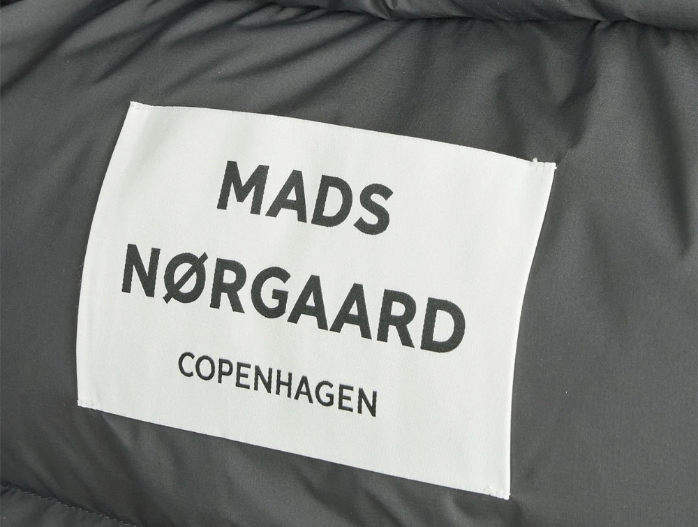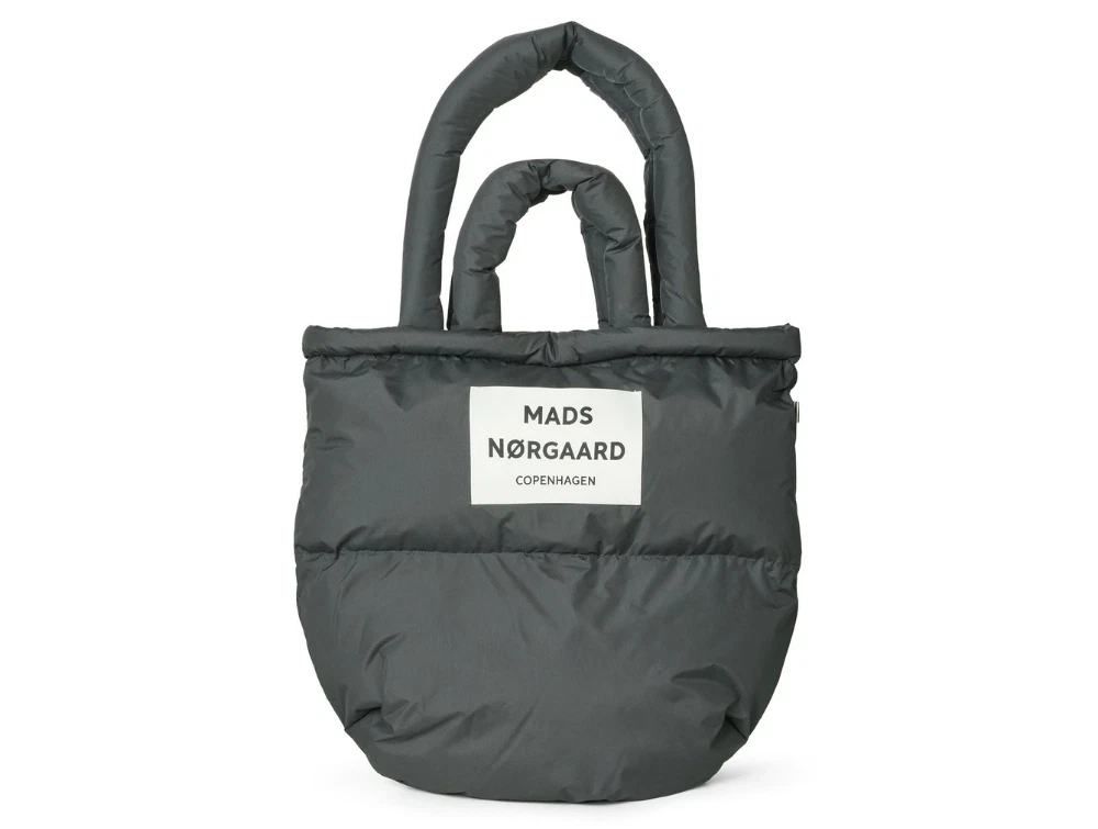 Mørkegrå taske fra Mads Nørgaard med korte og lange hankeNærbillede af Mads Nørgaard logo på mørkegrå puffetaske