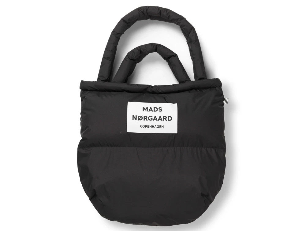 Sort taske fra Mads Nørgaard med korte og lange hankeNærbillede af Mads Nørgaard logo på sort puffertaske