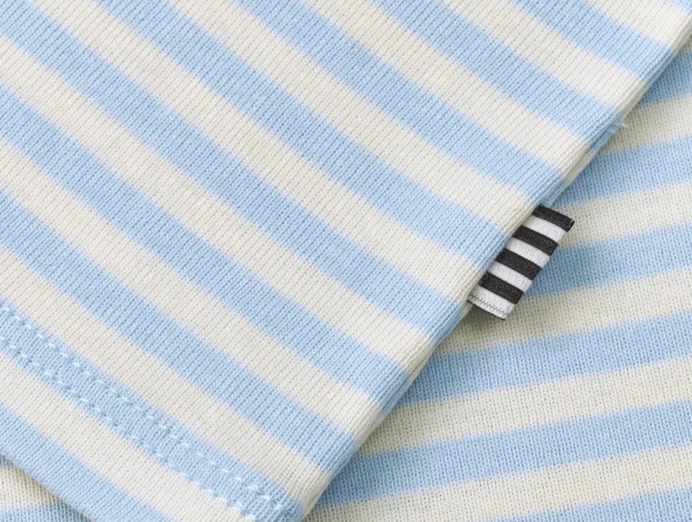T-shirt fra Mads Nørgaard i lyseblå og råhvide striberNærbillede af Mads Nørgaard Tobinino t-shirt med striber