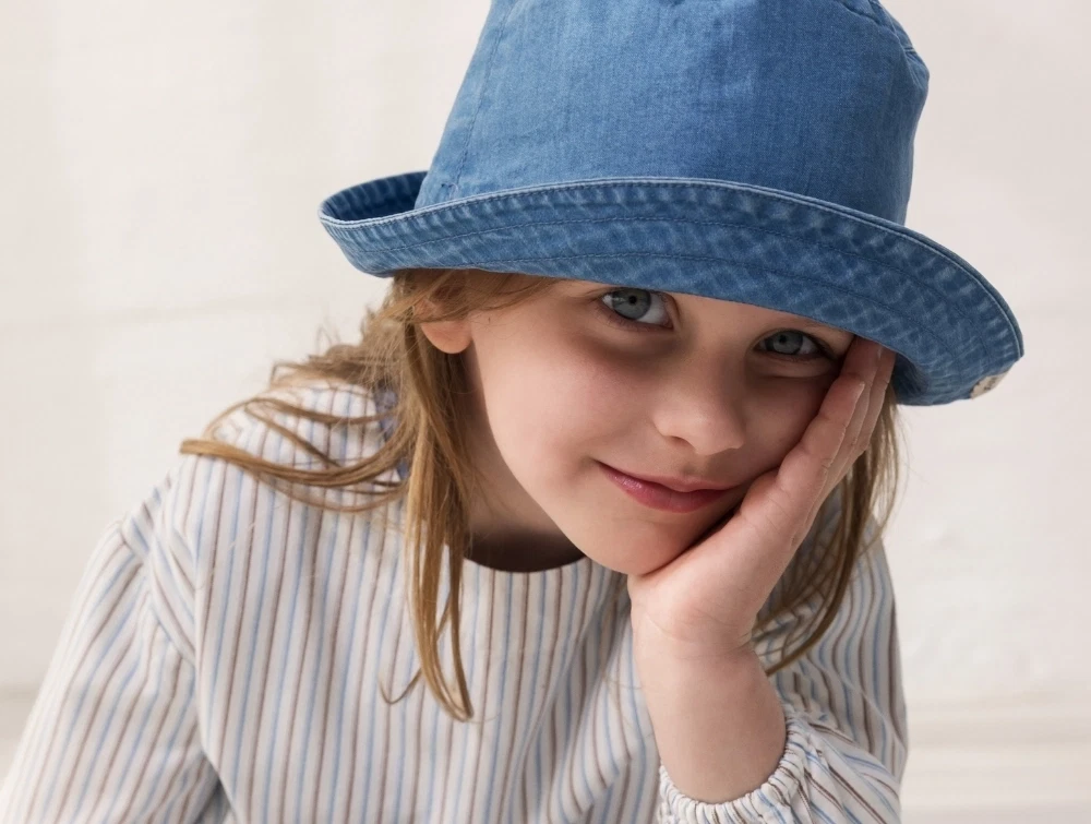 MarMar bøllehat i blue denimMarMar Arida bøllehat i blå denim på barnMarMar denim bøllehat med bred skyggeMarMar bøllehat set fra siden i blue denim
