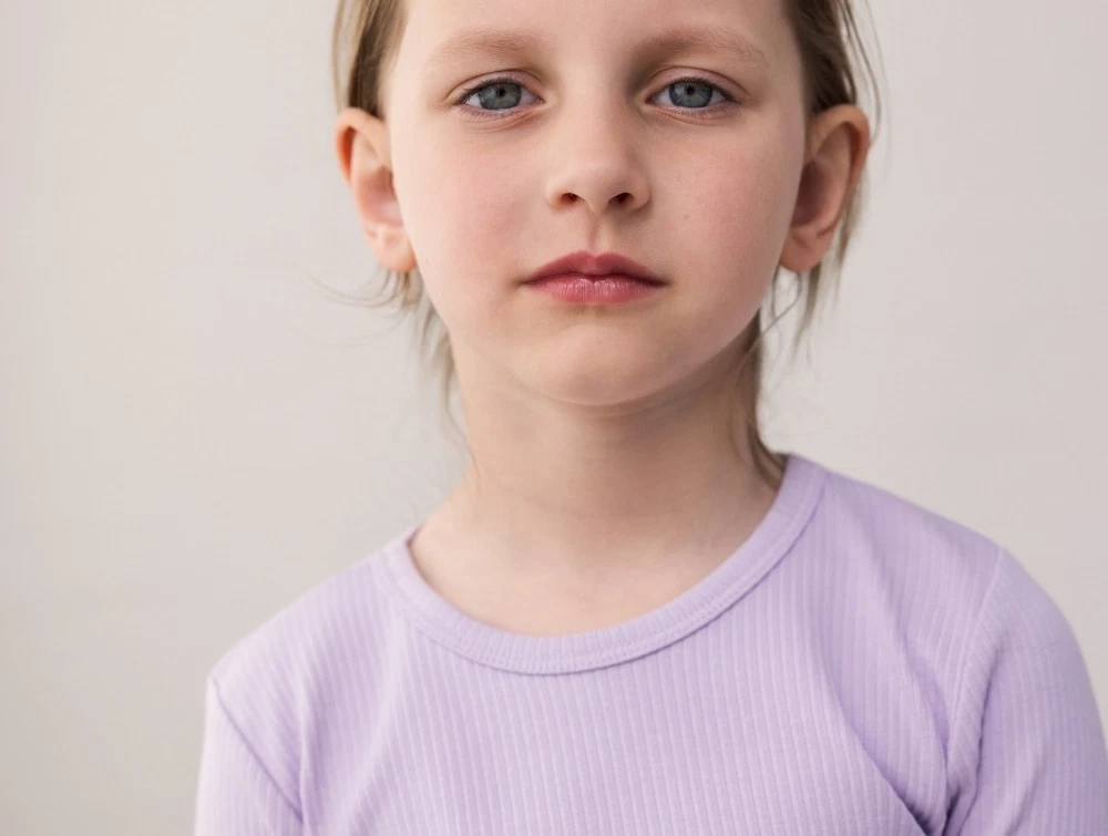 Materialet er let og åndbart og velegnet som inderste lag året rundt. Ribstrukturen giver naturlig strækbarhed, så blusen følger barnets bevægelser.