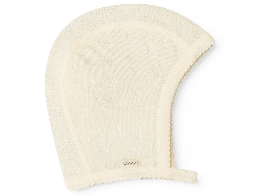 MarMar Copenhagen baby hjelm i natural uld pointelle set fra sidenMarMar Copenhagen baby hjelm i natural uld pointelle set bagfraMarMar Copenhagen baby hjelm i natural uld pointelle med syningsdetaljeMarMar Copenhagen baby hjelm i natural uld pointelle med lille logomærke