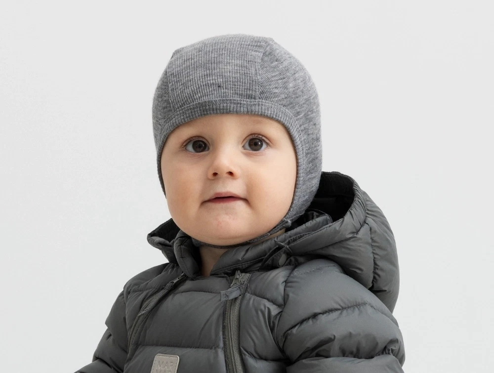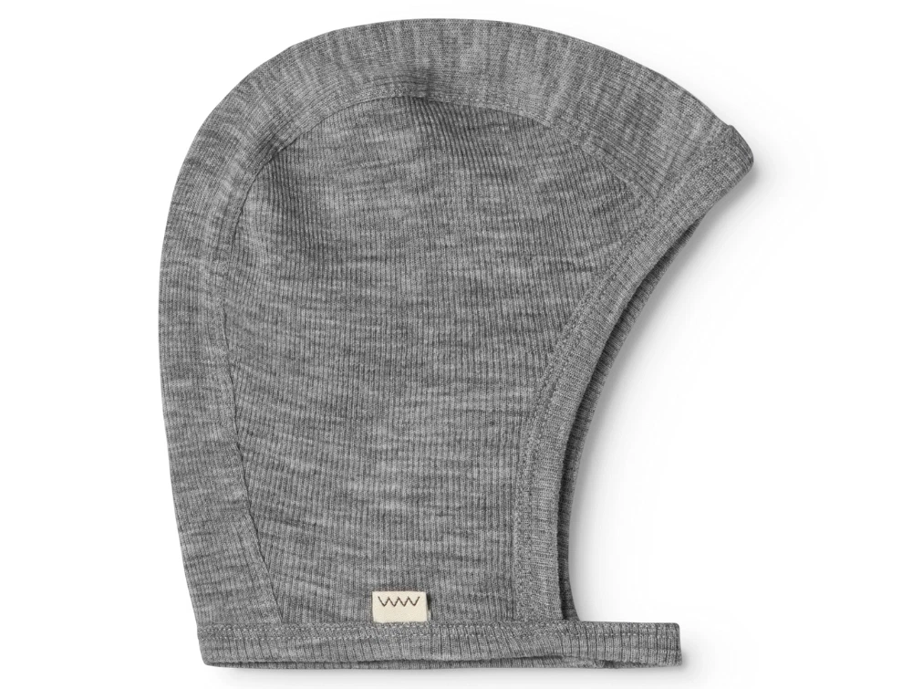 Babyhjelm i grå meleret uld rib fra MarMar Copenhagen med trykknaplukning