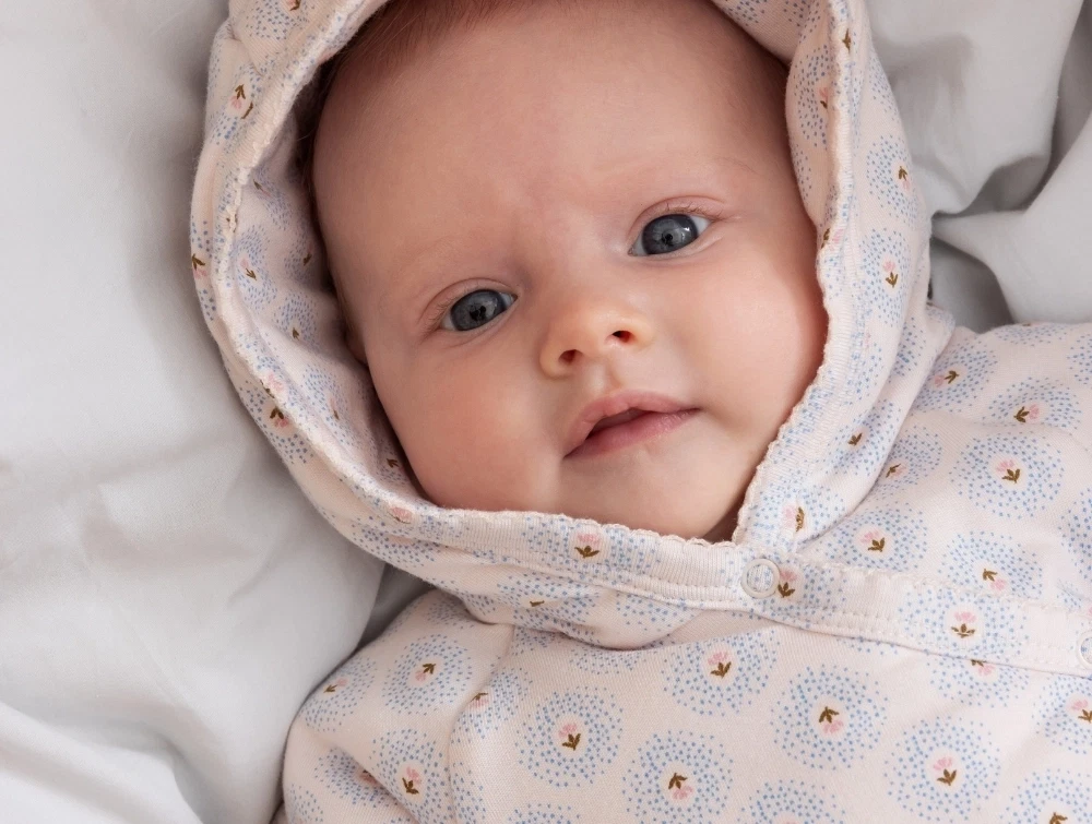 Dragten er fremstillet i en blød og fleksibel kvalitet med let vattering og hætte. Den har vendbare manchetter, som ved ombuk kan dække hænder og fødder og dermed give ekstra varme til nyfødte. Knaplukning i siden gør det nemt at tage dragten af og på.