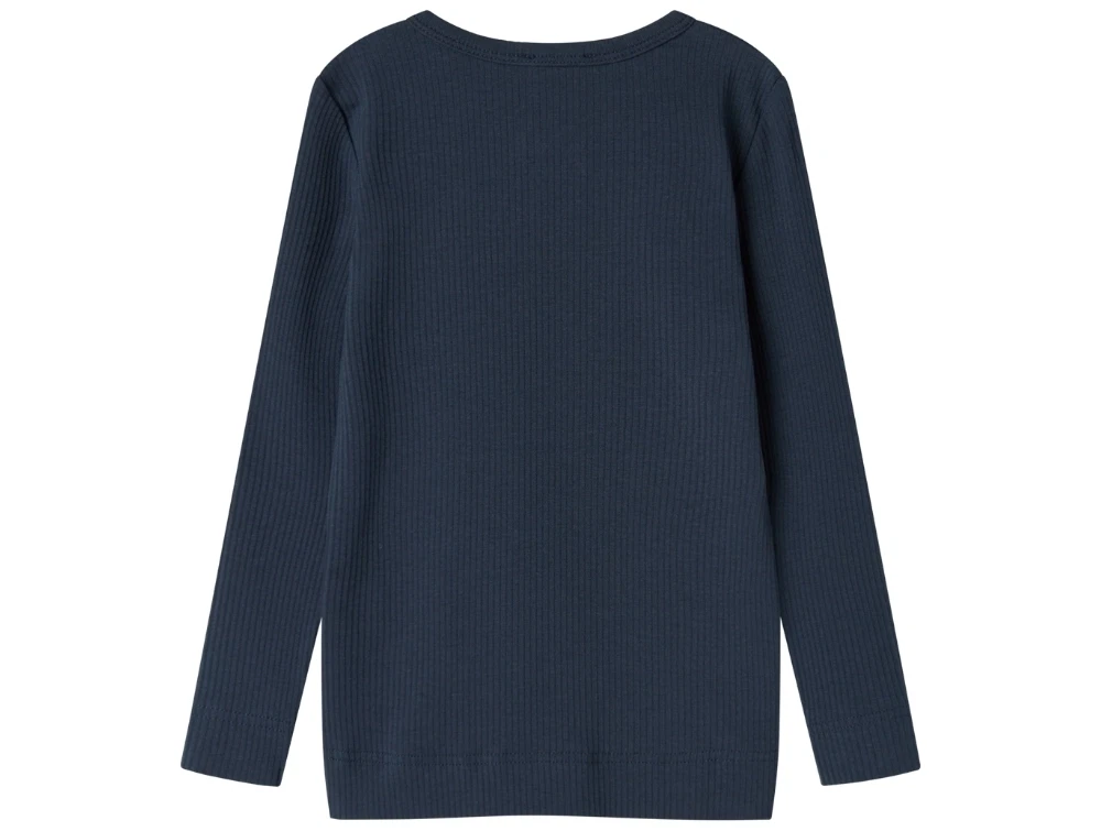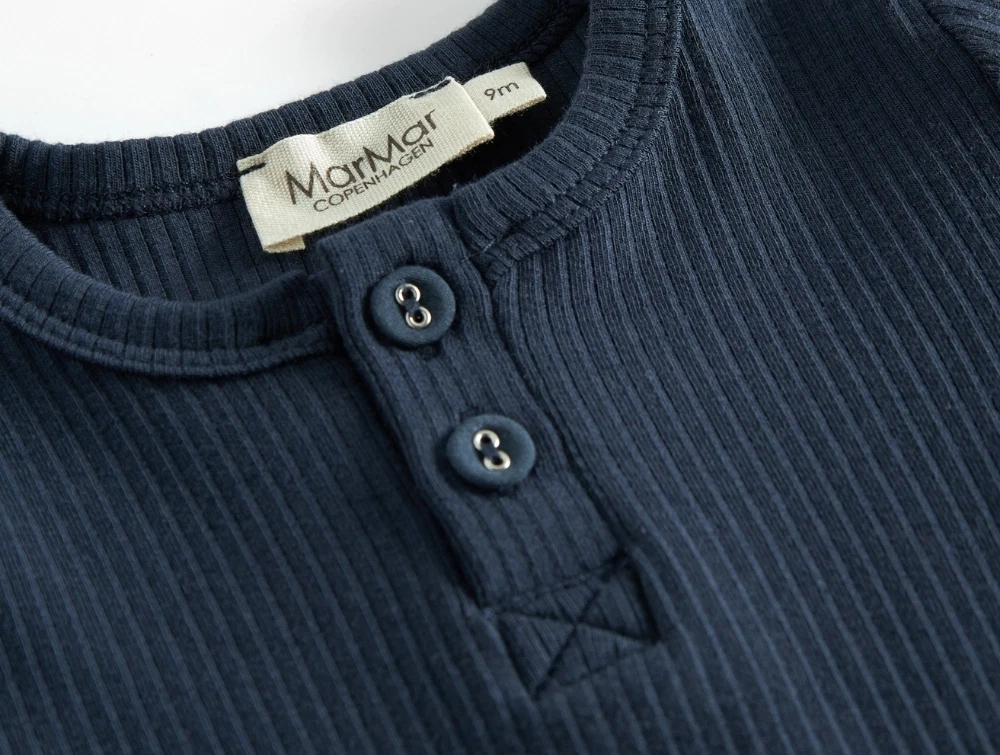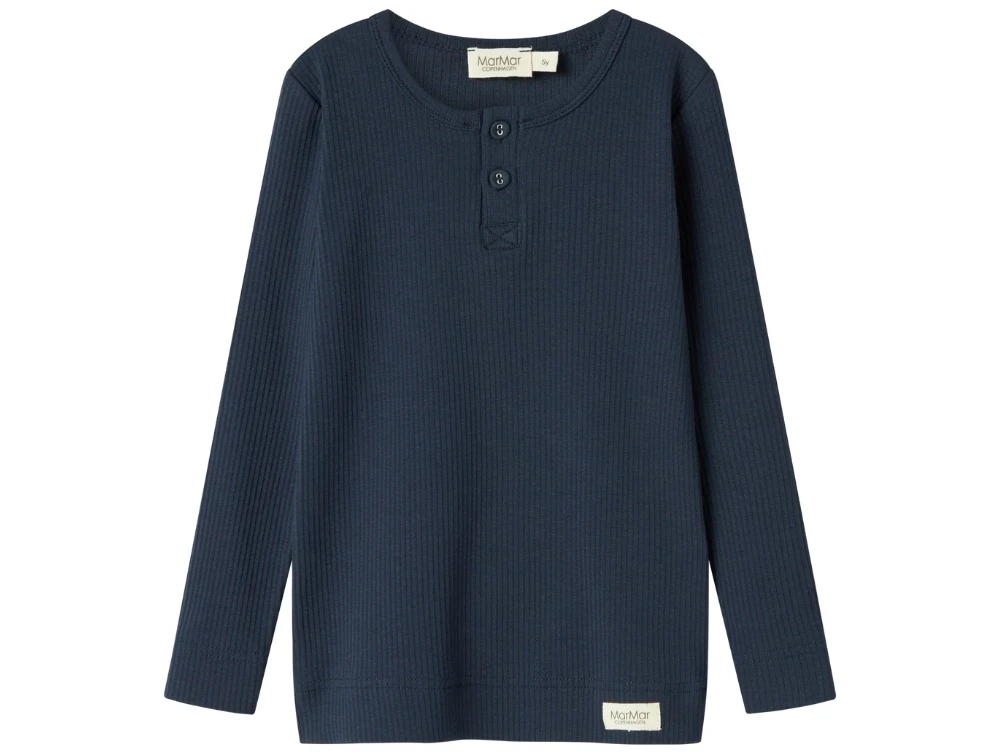 Langærmet t-shirt i mørkeblå  (pilot navy) fra MarMar Copenhagen. T-shirten har ribstruktur og stolpelukning med to knapper.