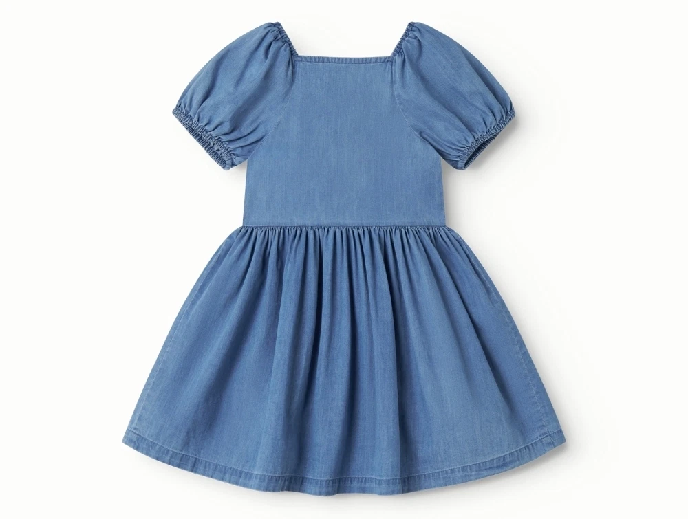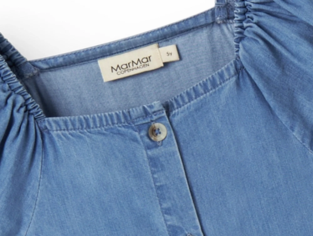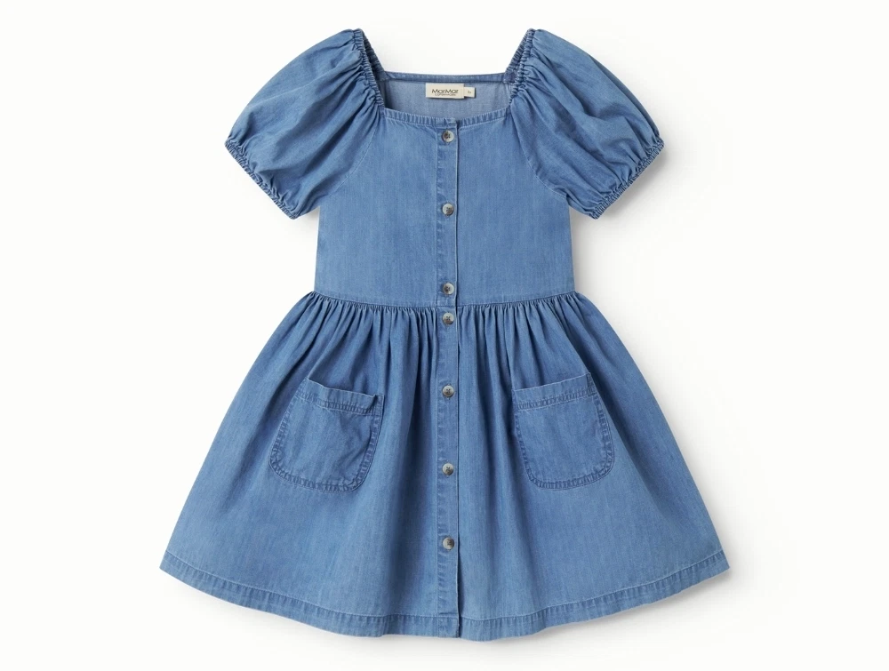 MarMar Davery kjole i blue denim med pufærmerMarMar Davery kjole i blue denim set på barnMarMar Davery kjole i blue denim med knapperMarMar Davery kjole i blue denim set bagfra