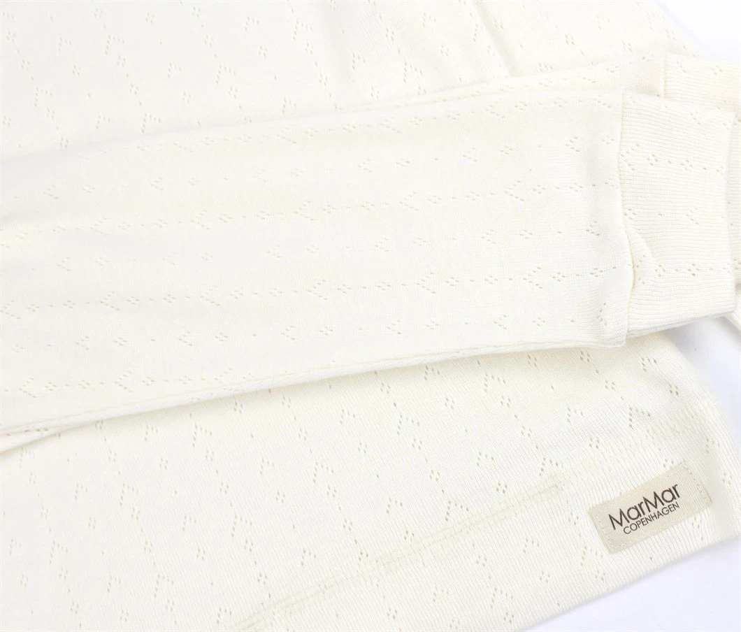 Sættet har pointelle hulmønster og er produceret i 50% økologisk bomuld og 50% modal.